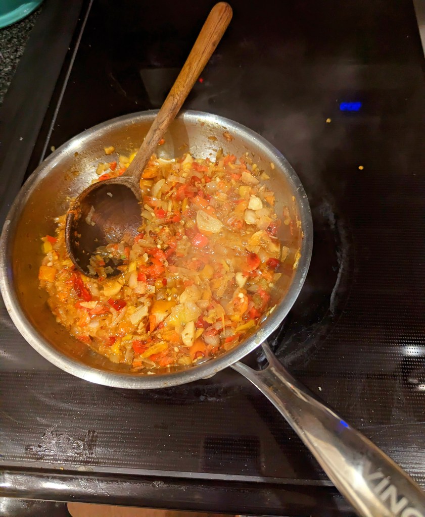 You can let it cook as long as you want. I stopped it when there was still some texture to the peppers and onions, but you could let it turn into almost a jam for a more concentrated flavor. Add salt to taste.