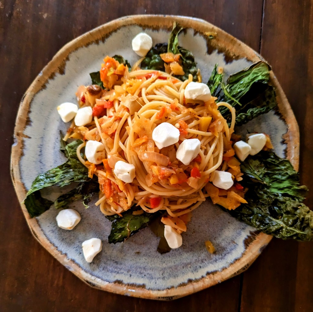 To serve, remove the pepper sauce to a bowl, add the spaghetti and toss repeatedly until all the strands are well coated. Add the greens and mozzarella pearls into the bowl and toss again. The result is a light but robustly flavored dish.