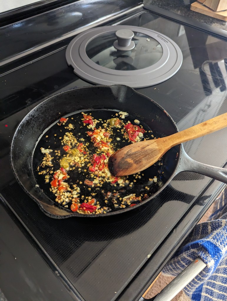 When the oil runs like water across the bottom of the pan, add the fennel and coriander seeds. When they smell fragrant and look golden brown, add the garlic and chilis and stir.